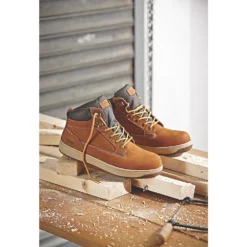 Chaussures de sécurité robustes et résistantes à l’usure avec couvre-embout moulé en caoutchouc et semelle en PU. Tige en cuir nubuck imperméable. Languette et cheville rembourrées.