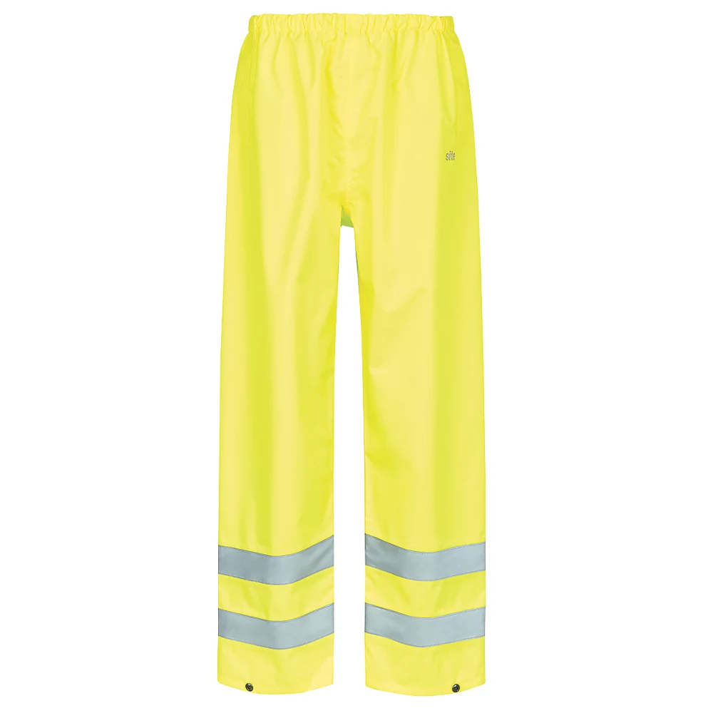 Surpantalon imperméable, léger et haute visibilité avec bande réfléchissante. Taille élastique, ourlet à boutons-pression réglable et 2 poches faciles d’accès (permettant d’accéder au pantalon). 190g/m².