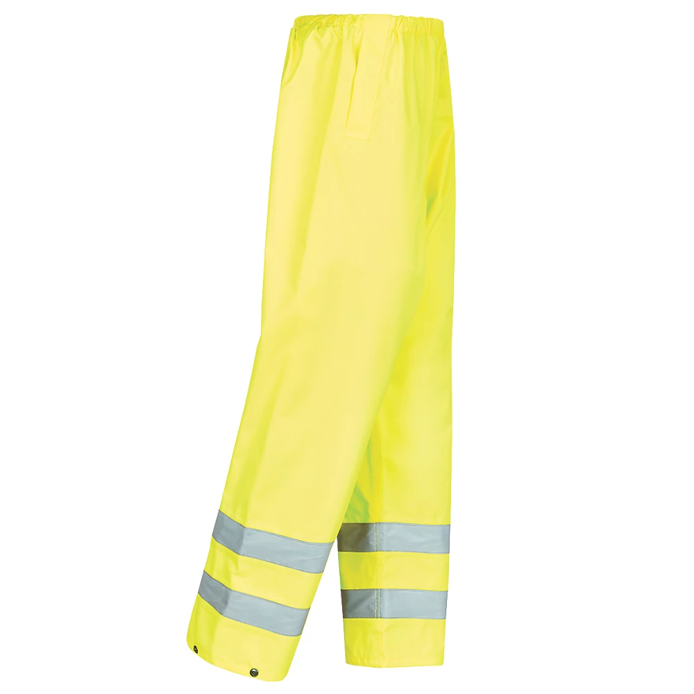 Surpantalon imperméable, léger et haute visibilité avec bande réfléchissante. Taille élastique, ourlet à boutons-pression réglable et 2 poches faciles d’accès (permettant d’accéder au pantalon). 190g/m².